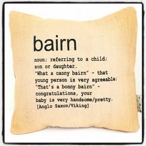 A hand made north east cushion inspired by the dialect of the North East. The hessian outer is printed in black with the dictionary style definition of the North East word Bairn.