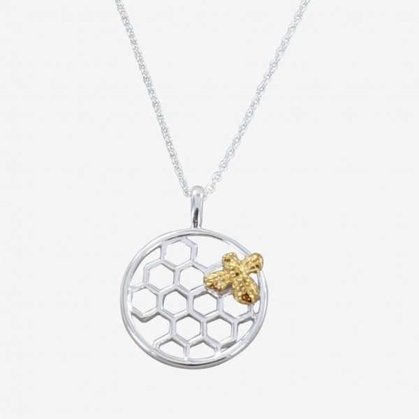 A stunning Bee and Honeycomb necklace, from the Contemporary range by Reeves Reeves. Made from Sterling Silver with gold plated bee design and presented in a lovely gift box.