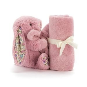 This gorgeous Blossom Tulip bunny soother is a sweet little toy to comfort babies and toddlers to help them sleep. The bunny soother is a perfect new baby gift. A sweet, little, dusky pink bunny with floppy ears that has gorgeous flowered material bits in the centre of them. The little bunny holds a square blanket that acts as the soother.