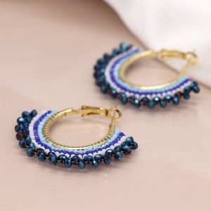 Golden hoop earrings with blue mix striped multi bead fan detail