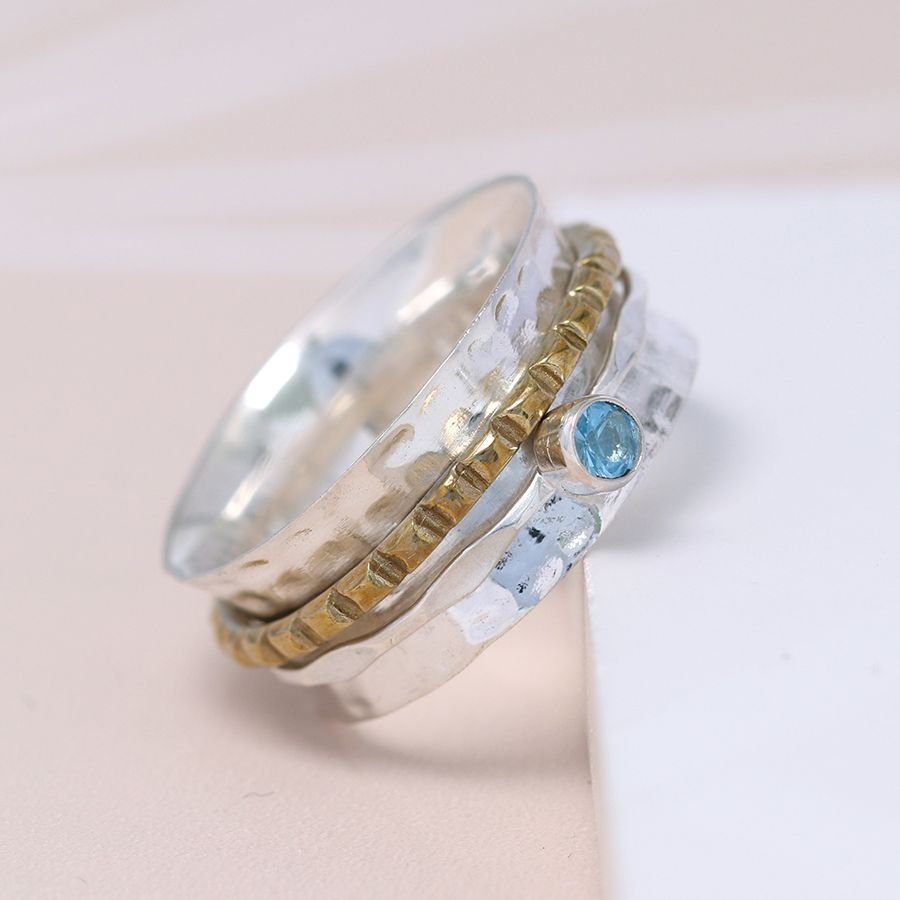 This beautiful ring has been made from pure sterling silver and given a lovely hammered texture. Additionally the spinning brass ring has a ridged texture and the faceted blue topaz is set on a fine silver band.