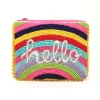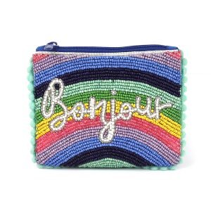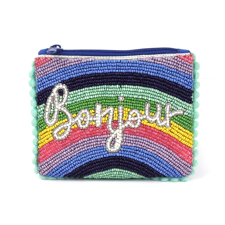 A multicolour mix rainbow beaded zip purse with ‘Bonjour’ motif and mint pom-pom trim