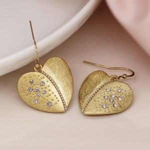 A beautiful pair of brushed gold heart earrings with crystals and silver beads