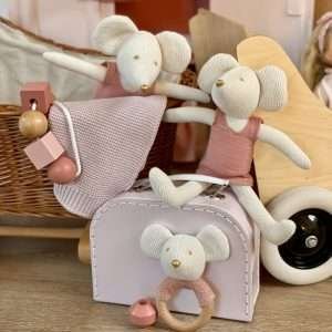 A cute Celeste Mouse with a sweet pink dress making a great little gift from Egmont toys. With her long arms and tail in cotton, she is easy to hold. So much fun to hear her rattle! The soft pink dress is in double gauze cotton.