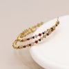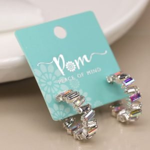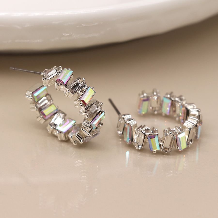 Silver plated open hoop stud earrings created by staggered claw settings, each containing a faceted oblong clear crystal with a pearlescent style