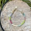 A stunning Colourful Chevron Bracelet with an adjustable fastener from Azuni jewellery. Gold plated fixings with stunning seed beads in a zigzag pattern in a range of pink, blue and green earthy tones. A beautiful bracelet that would look fantastic with any outfit.