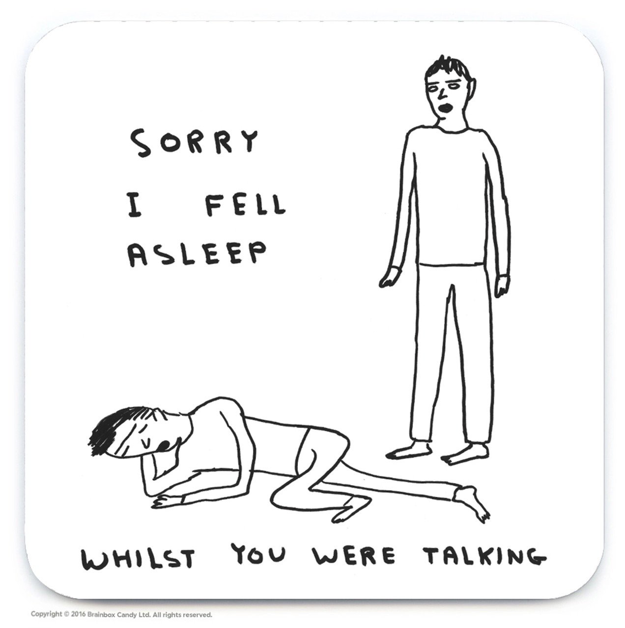 A brilliant David Shrigley Sorry I Fell Asleep Coaster from Brain Box Candy