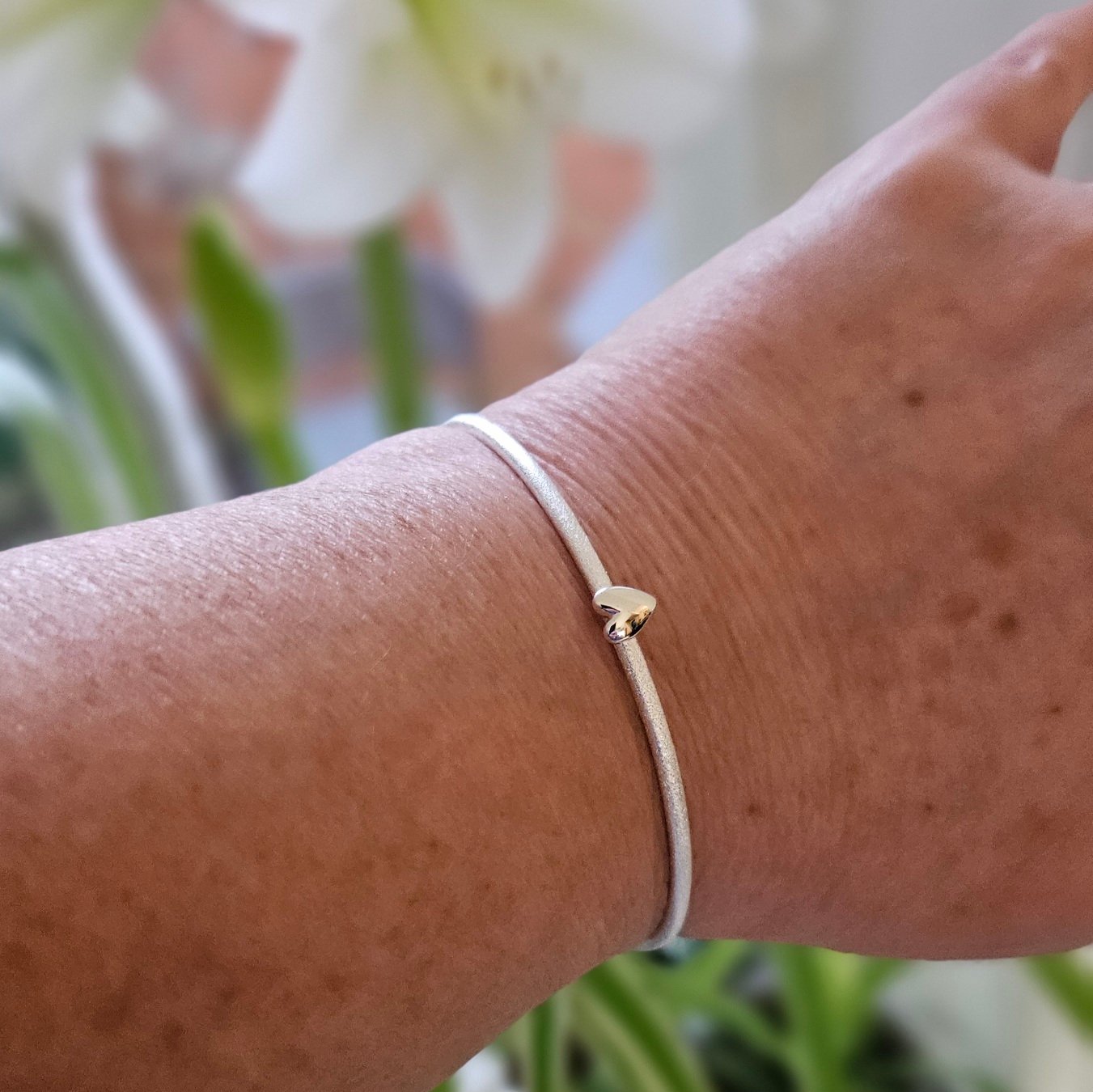 A gorgeous bangle with an unusual and elegant sandblasted finish with a three dimensional high shine heart in sterling silver.