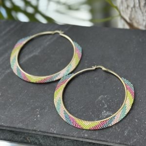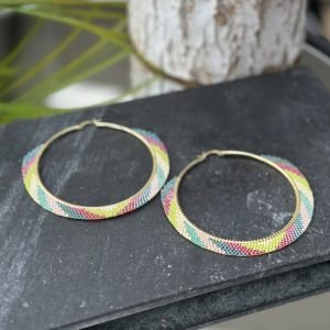 A stunning pair of dramatic Extra Large Colourful Beaded Hoop Earrings from Azuni jewellery. Gold plated earrings with stunning seed beads attached in a range of pink, blue, green and cream, summer hues. A beautiful pair of earrings that would look fantastic with any outfit.