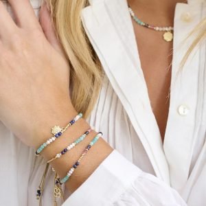 Elevate your style with the epitome of sophistication – our exquisite Halia Mixed Gemstone Necklace adorned with a stunning array of gemstones. Turquoise, lapis lazuli, Amazonite, Howlite, Iolite, Pink Tourmaline, and mother of pearl marbles converge in a harmonious symphony of colors and textures, crafting a truly captivating piece of jewelry that radiates elegance.