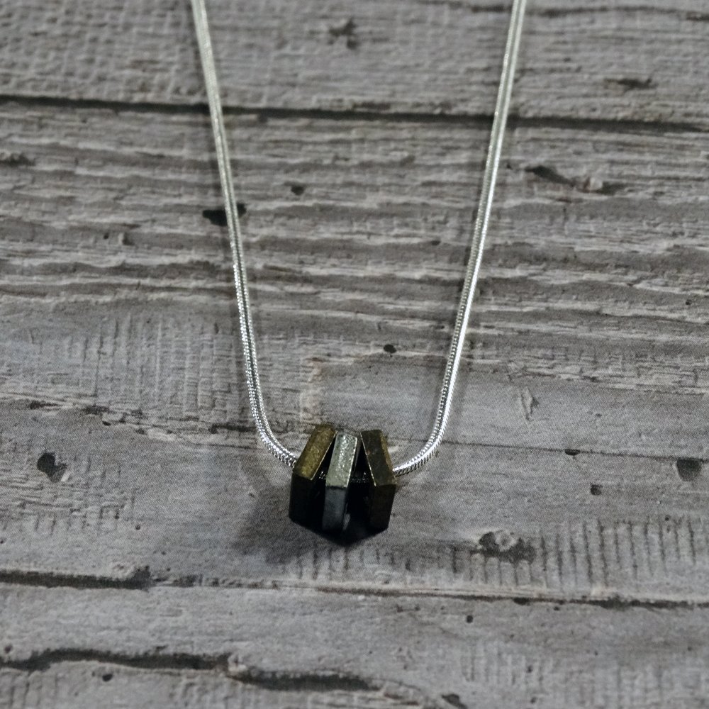 The mix of materials in the pieces of this collection is a key feature. Silver, brass and steel are combined to create distinctive, edgy jewellery to tone well with everyone’s skin and hair colours.