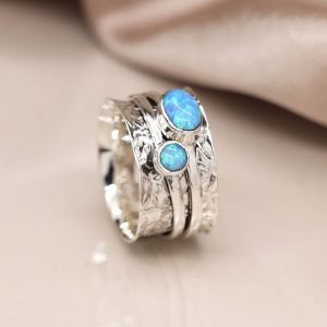 A gorgeous Leaf embossed opal spinning ring. Sterling silver wide band spinning ring with embossed leaf detail and double opal cabochons on moving bands