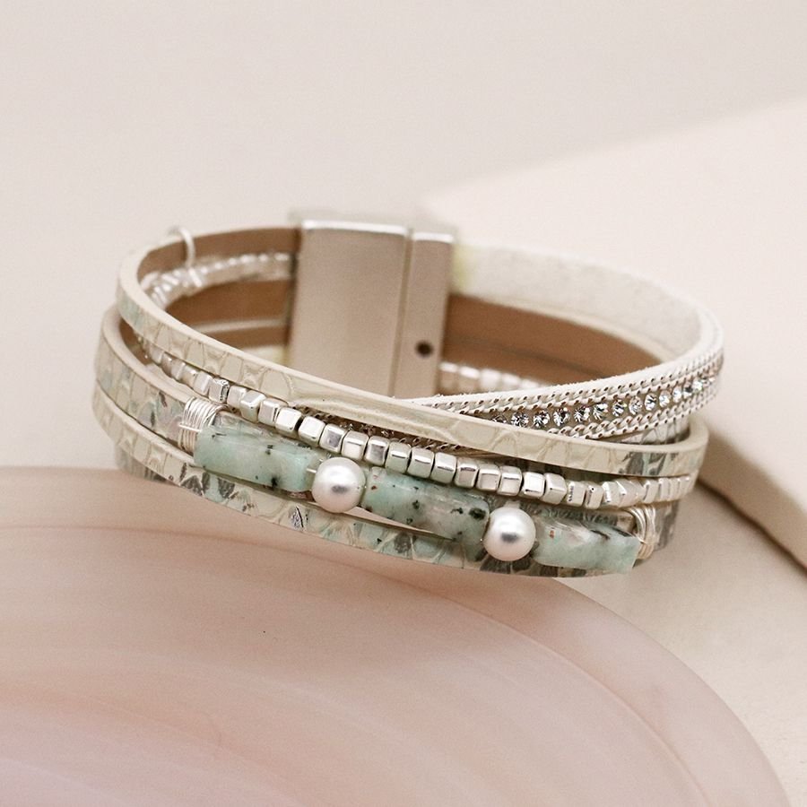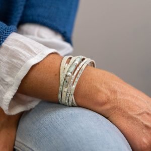 Pale grey multistrand leather bracelet with silver plated beads, crystals and aqua oblong stones from Peace of Mind