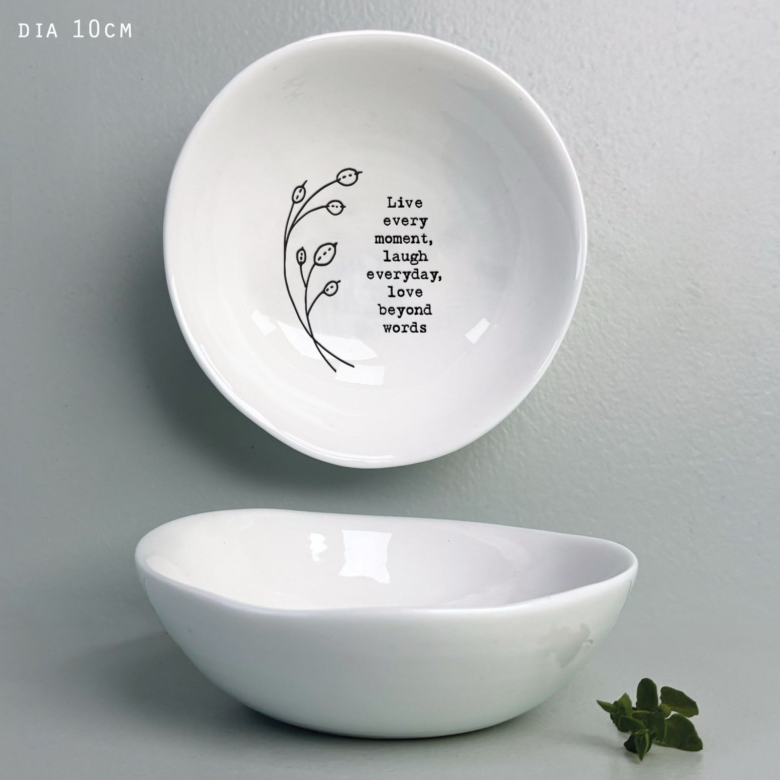 A lovely porcelain Live every moment Medium bowl from East of India. With the words ‘Live every moment, Laugh every day, love beyond words.’
