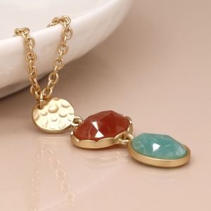 Faux gold plated triple shape pendant with a hammered disc, brick red and turquoise stones in worn golden settings on a golden chain