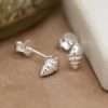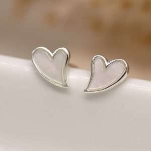 Sterling silver curved heart stud earrings with Mother of Pearl inlay, fastened with silver butterfly clasps.