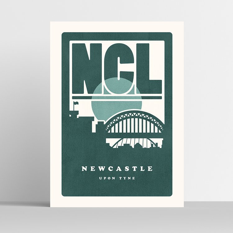 Bold ‘NCL’ Newcastle upon Tyne artwork. Featuring silhouette’s of the Tyne Bridge, Castle Keep, and Millennium Bridge.