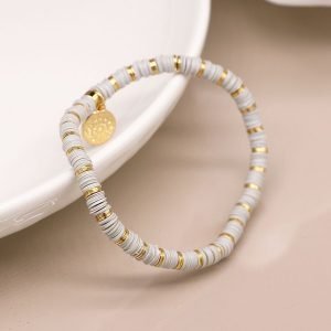 Pale grey fimo bead bracelet with golden spacers, finished with a golden POM tag from British jewellery designer Peace of Mind.