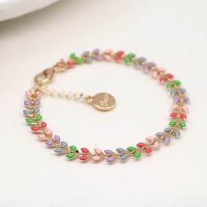 Faux gold plated paired droplets bracelet with pastel colour epoxy detail, golden lobster clasp and extension chain