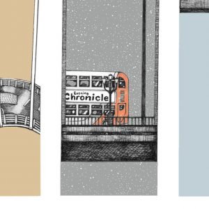 A pen and ink North East print of the bridges, depicting the Seven Ways to Cross The Tyne.