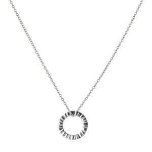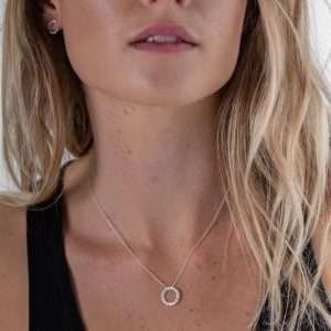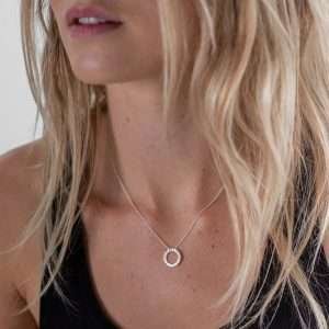 A stunning silver necklace contemporary circular pendant worn on an adjustable chain