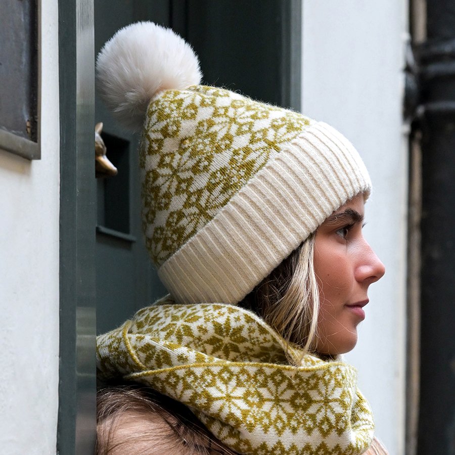Scandi style starflower knit bobble hat with faux fur pom-pom