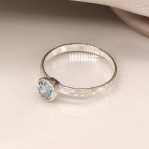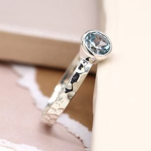 Hand crafted silver ring with a hammered finish and a blue topaz gemstone from POM.