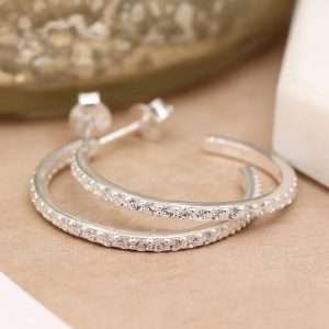 Sterling silver classic hoop earrings inset with a single row of CZ crystals along the outer edge and fastened with sterling silver butterfly clasps