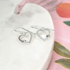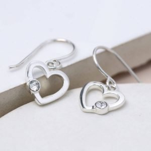 Beautiful drop earrings in sterling silver. Elegant cut out hearts with a cubic zirconia crystal detail.