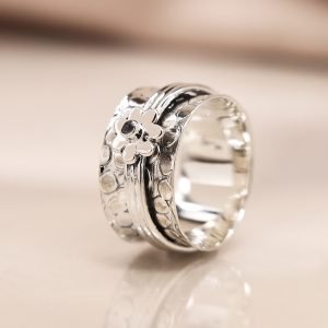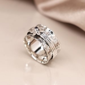 Sterling silver wide band ring with embossed dotty pattern and iolite centred flower on moving bands