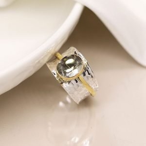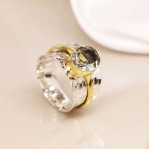 Sterling silver wide band spinning ring with beaten surface, faceted green amethyst and brass moving band