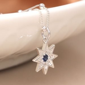 Sterling silver station necklace with a star pendant inset with crystals and finished with navy gems