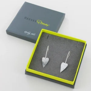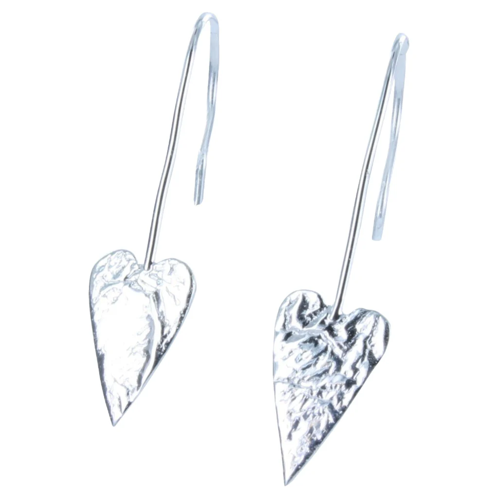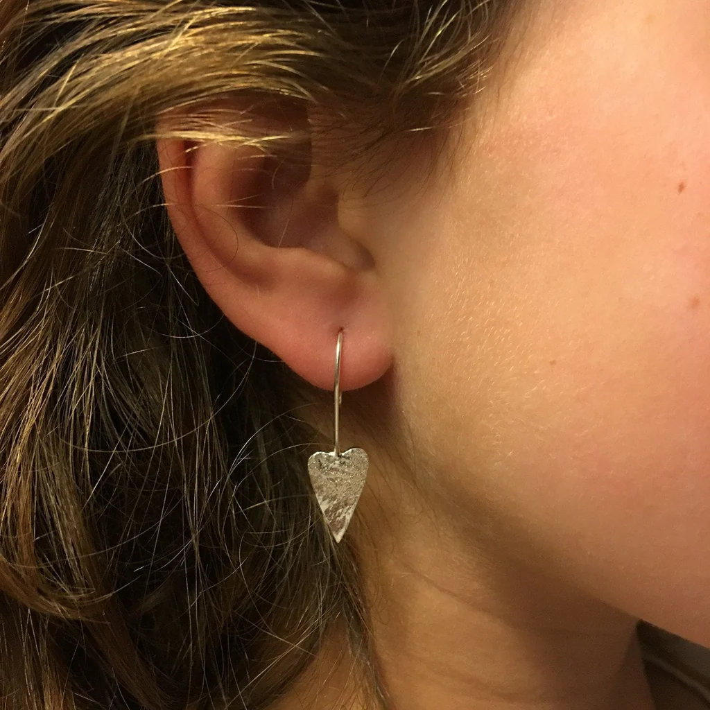 These sterling silver heart earrings have a beautiful hammered textured to them which really catches the light. Their unique drop style adds a touch of elegance to any outfit.