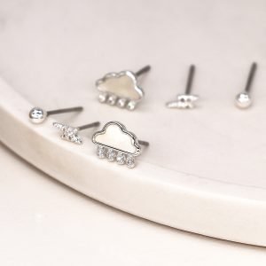 Silver plated triple stud earring set with clouds, lightening and little beaded studs