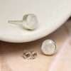 Sterling silver turquoise stud earrings in round settings with oxidised decorative dotted edge.