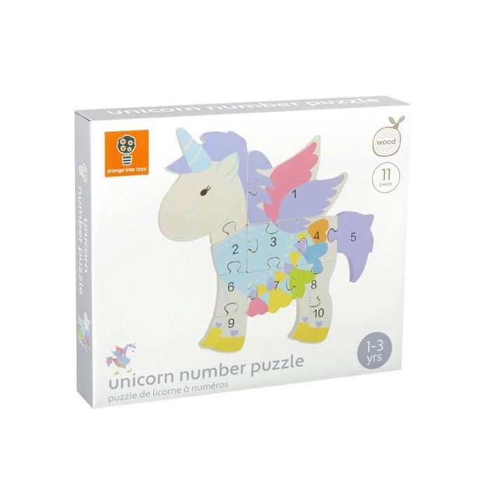 A brilliant Unicorn Number Puzzle from the wooden toy range by Orange Tree Toys. Comes boxed in sturdy packaging.