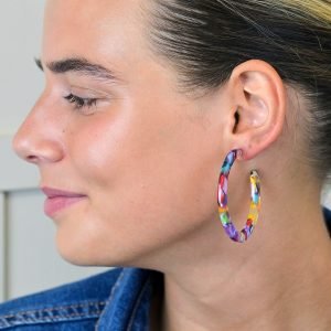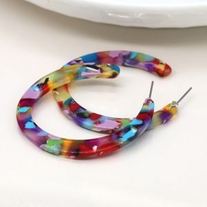 Vibrant multicoloured acrylic flattened hoop stud earrings with terrazzo effect
